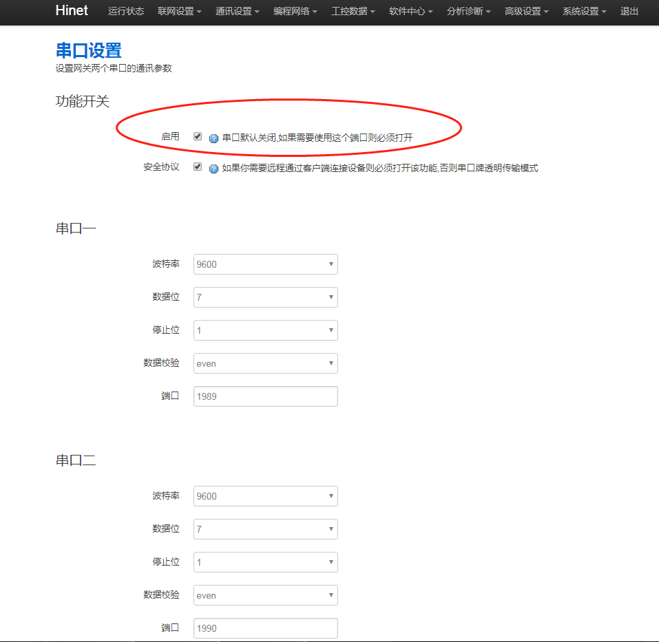 1. 网关串口功能是否开启,进网关后台,点击“通讯设置 - 串口设置”,串口勾选【启用】。